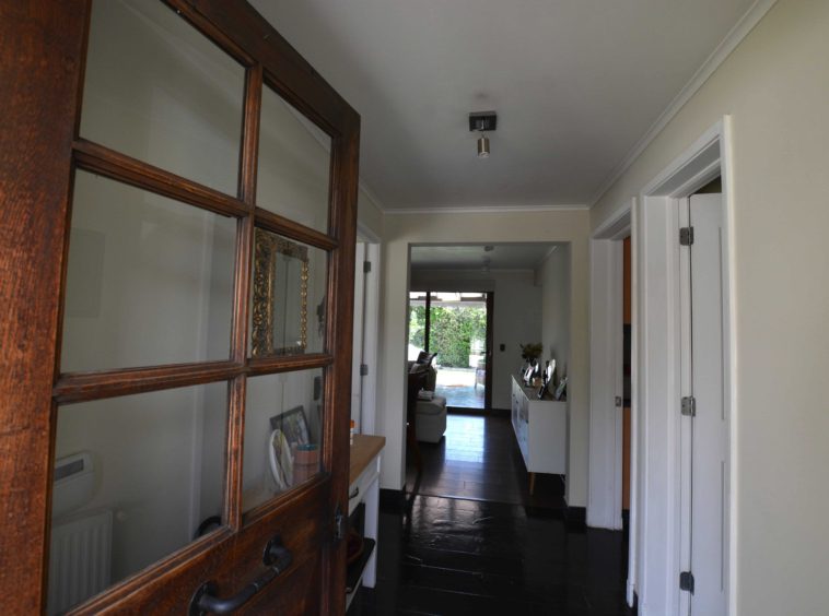 La casa se distribuye en un solo piso, con un hall que conecta cocina, living, y zona de dormitorios separados por una puerta.