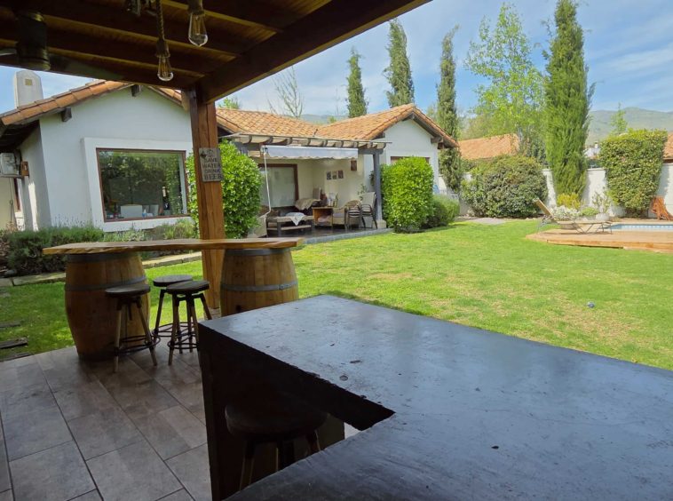 Quincho techado, con parrilla a carbón, mesón en obra de hormigón, ventiladores.