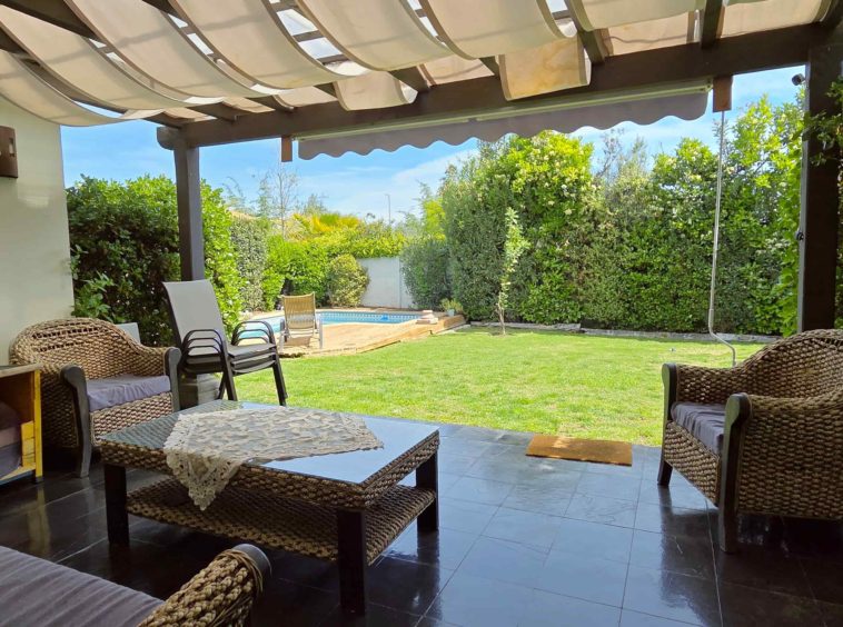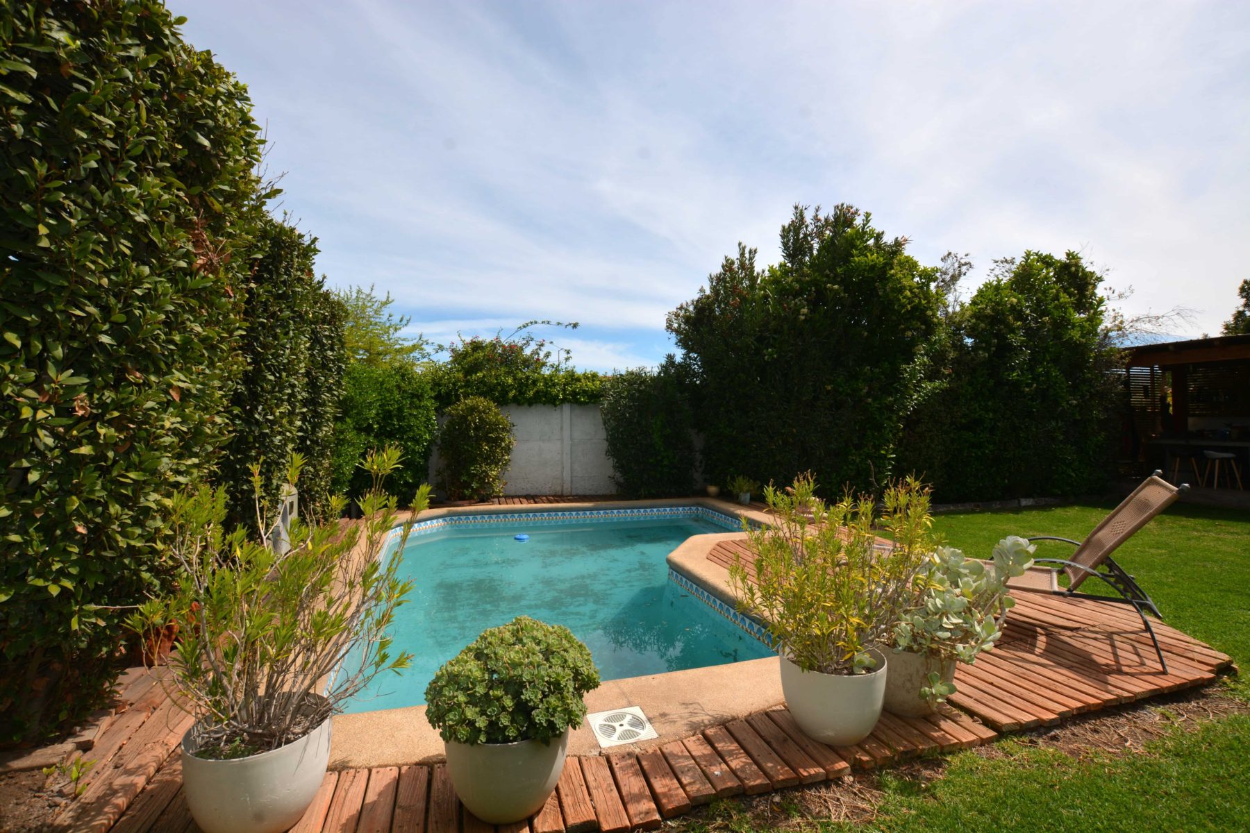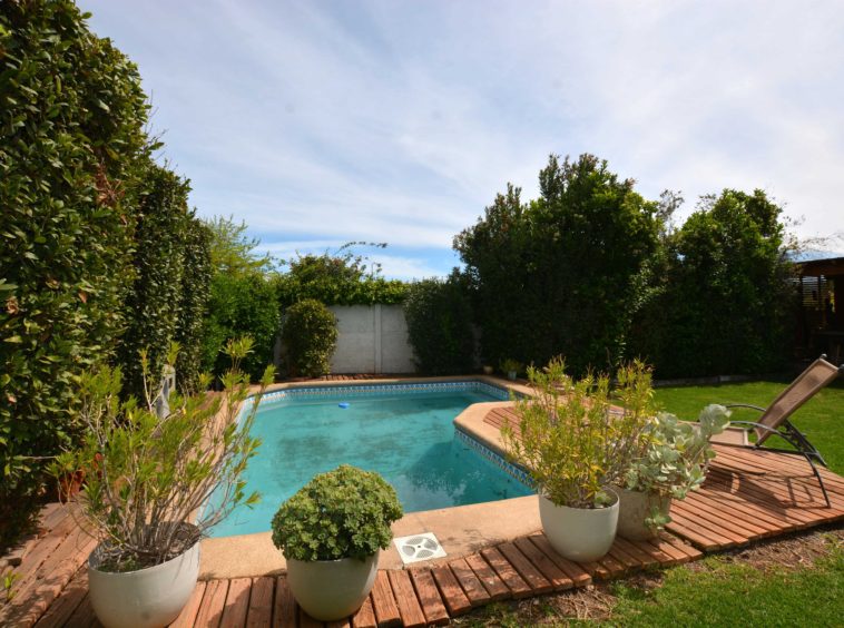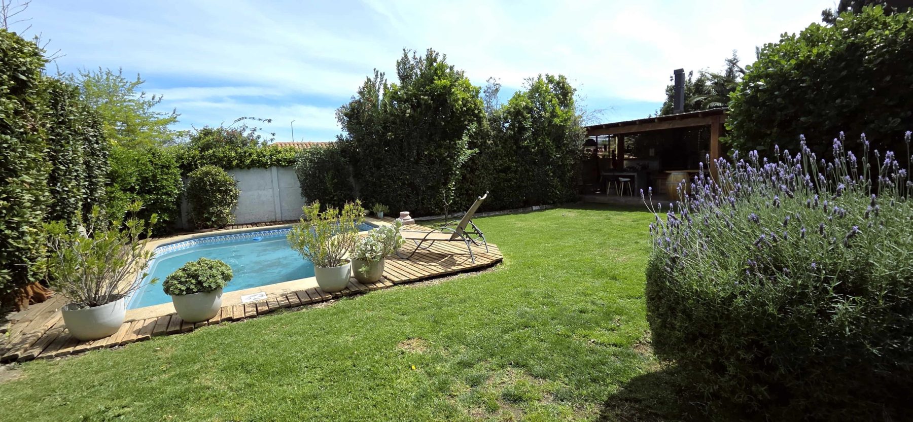 Jardín formado, piscina con bomba de calor y deck para reposeras.