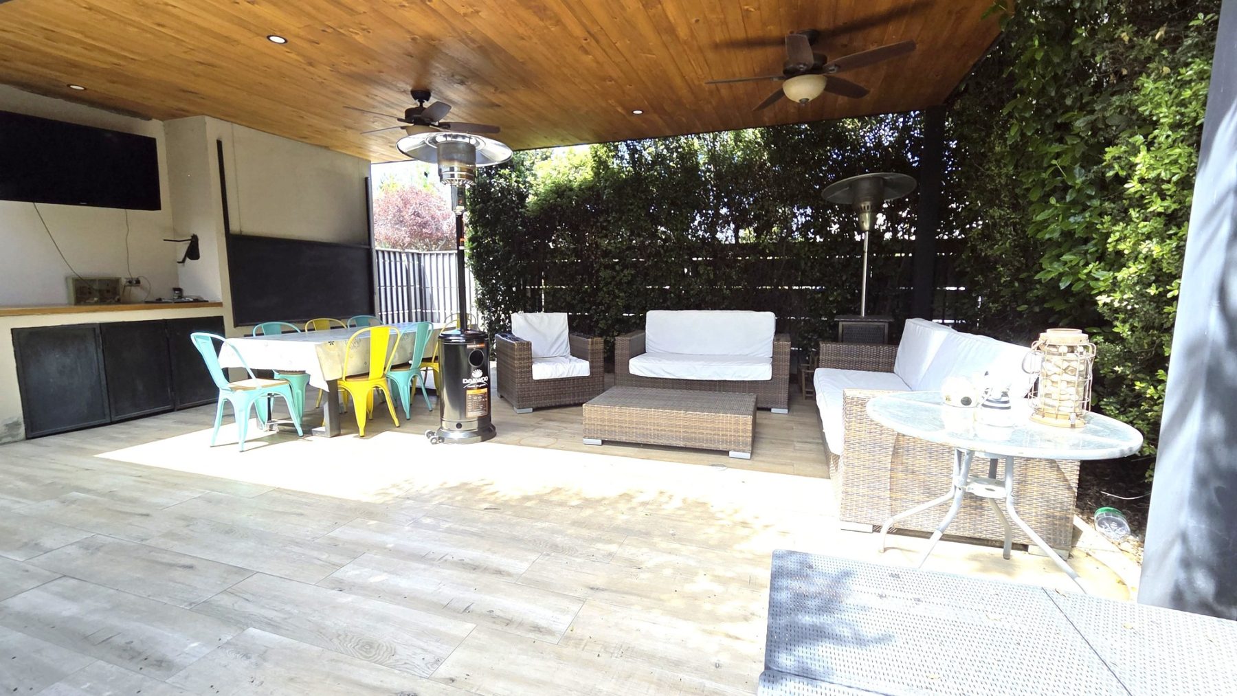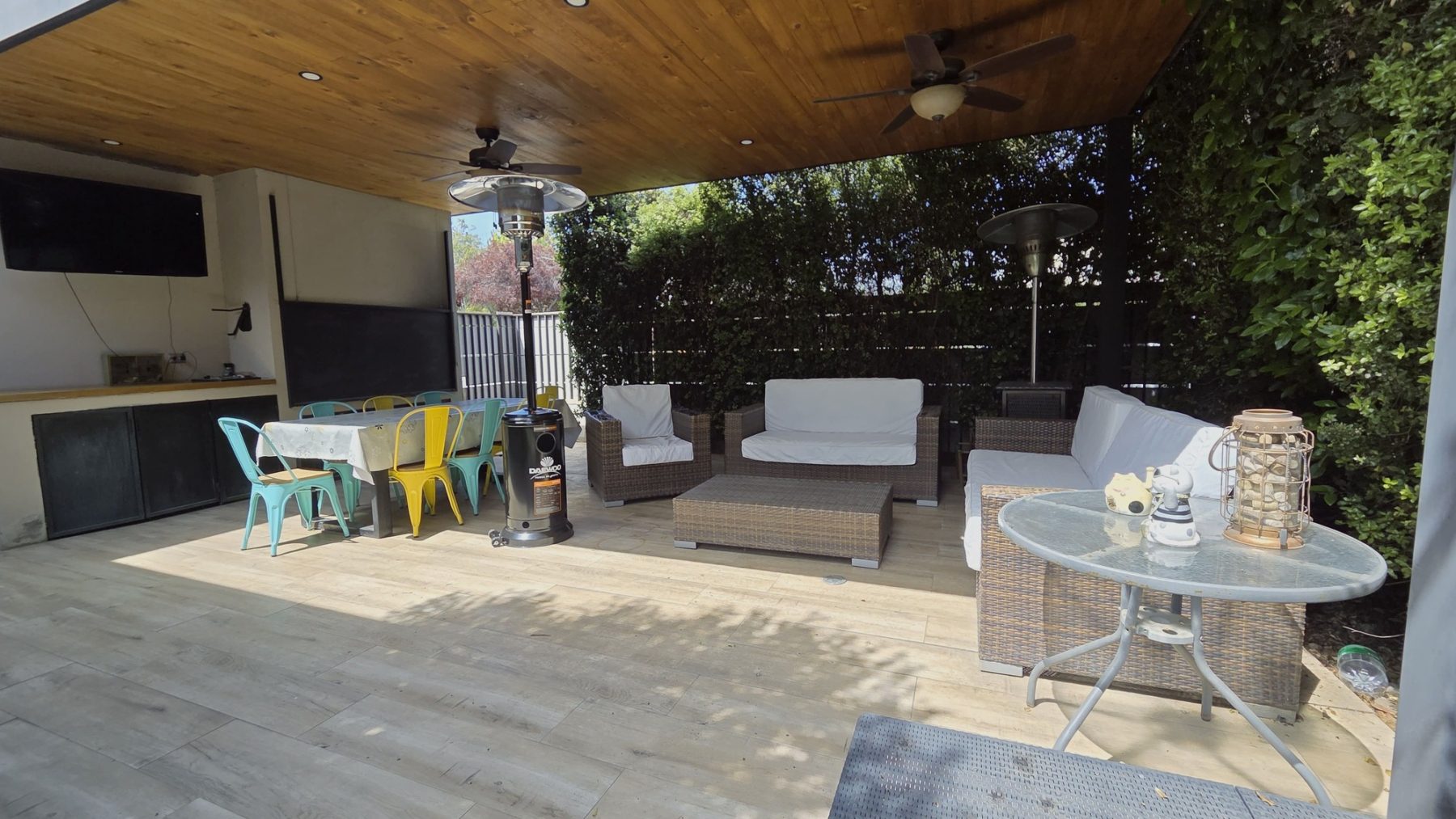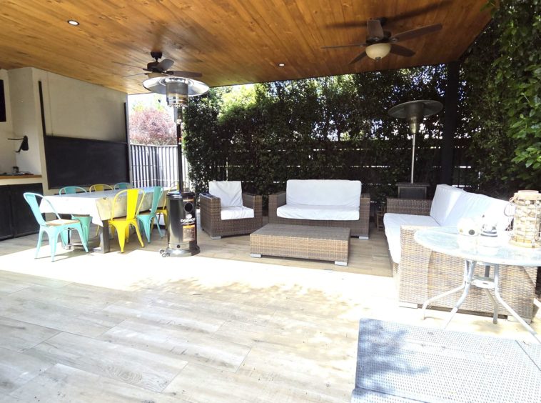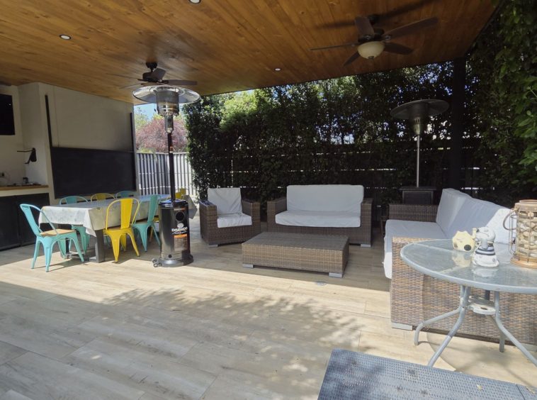Amplio quincho techado con parrilla a carbón y sistema de cierre tipo guillotina