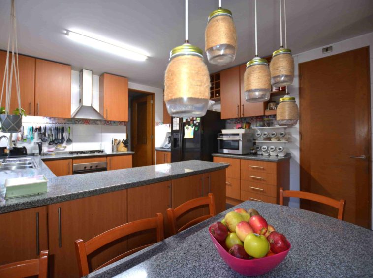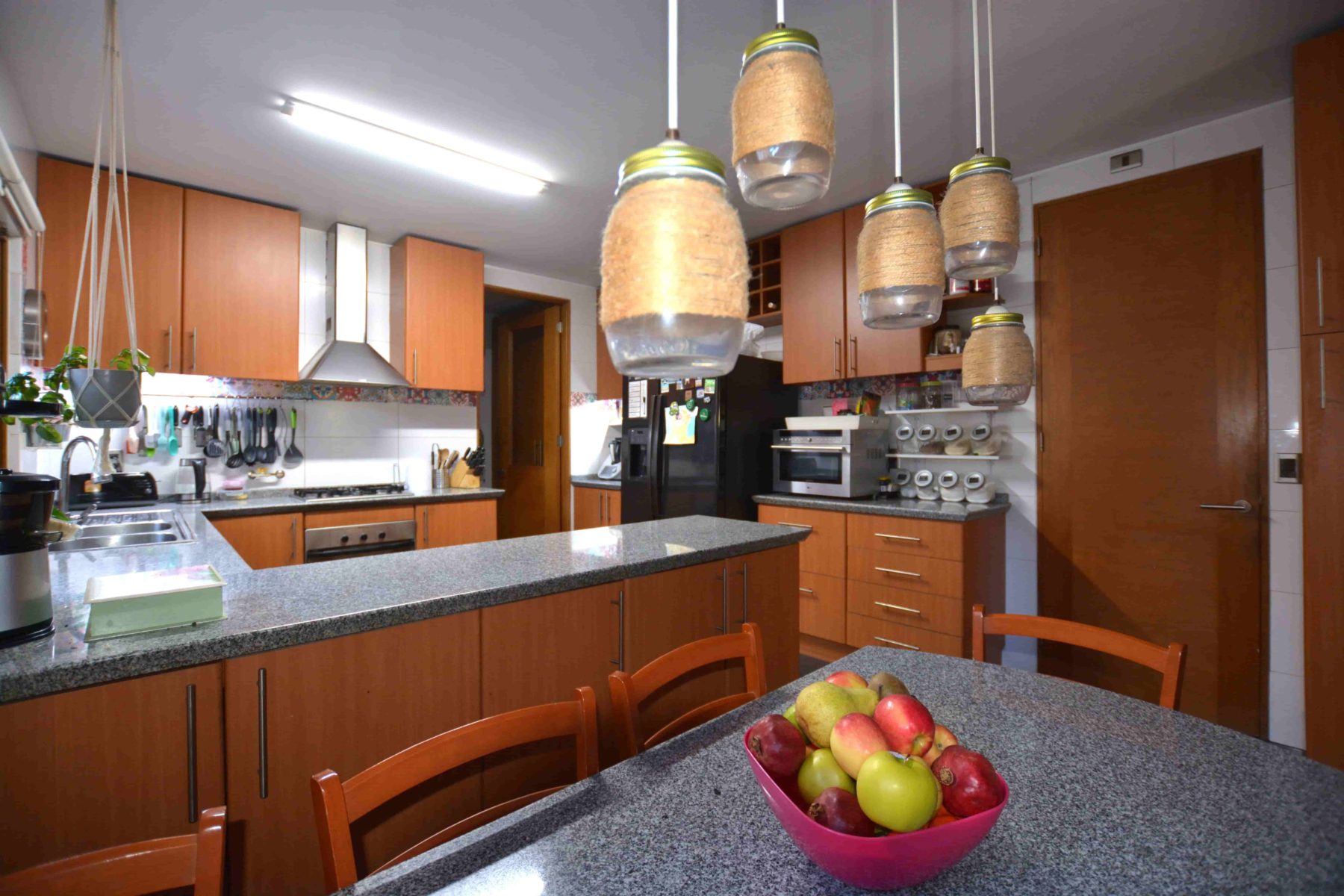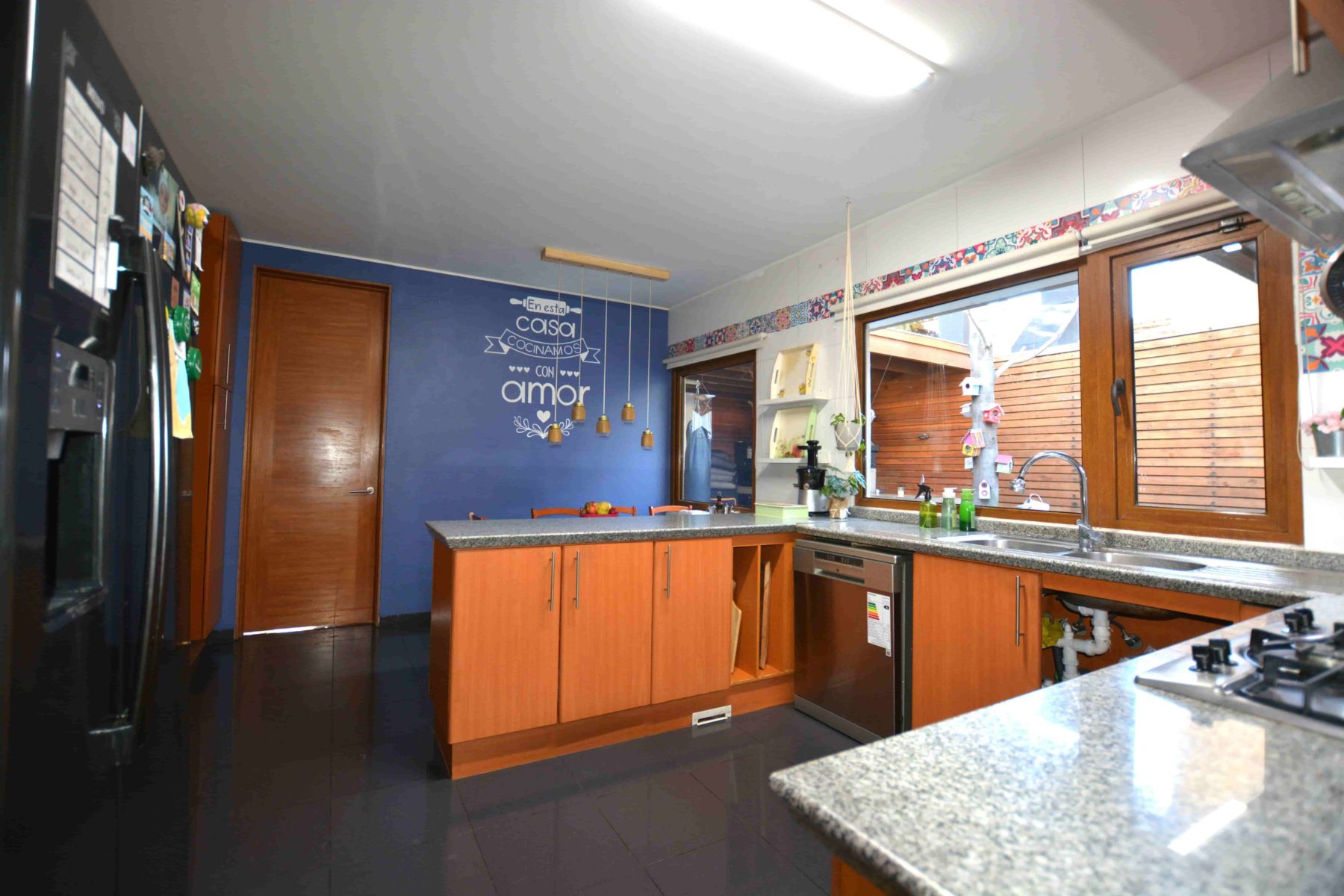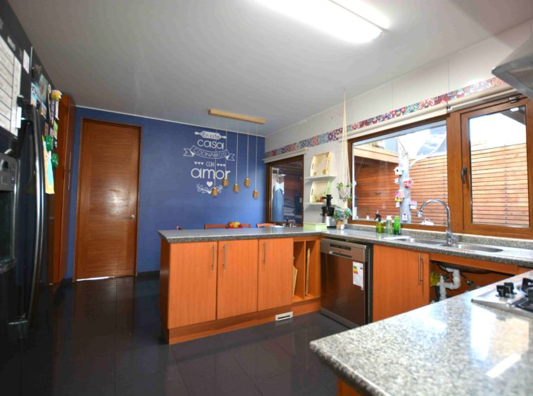 En el otro costado de la casa, se encuentra una amplia y luminosa cocina, equipada con horno empotrado, cubierta de granito y un cómodo comedor de diario. Además, cuenta con una práctica despensa en la zona de servicio, que conecta con el dormitorio de servicio y una logia techada.