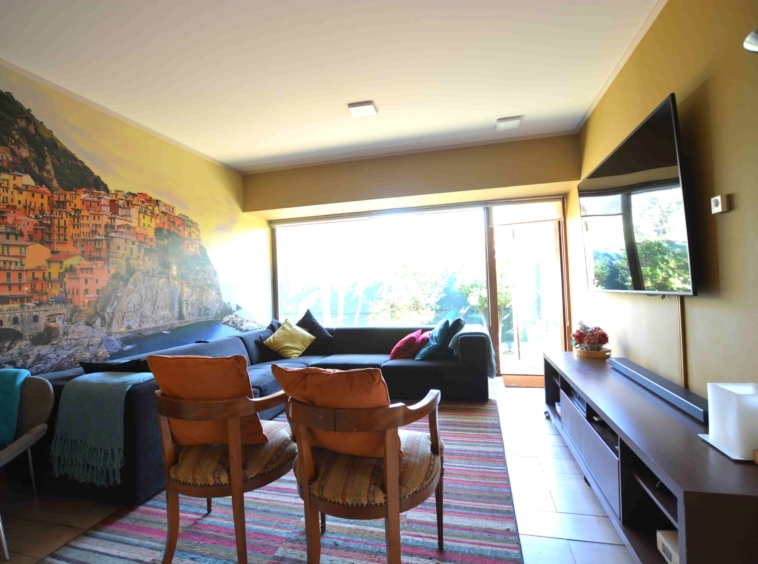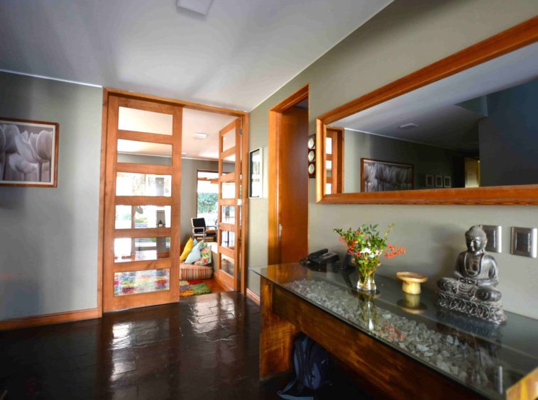 Amplio hall de acceso con piso de porcelanato. Desde aquí se accede al living-comedor a través de una elegante puerta de madera. Este espacio cuenta con salida a una terraza techada y vistas a los jardines, ofreciendo un ambiente ideal para compartir en familia o con amigos.
