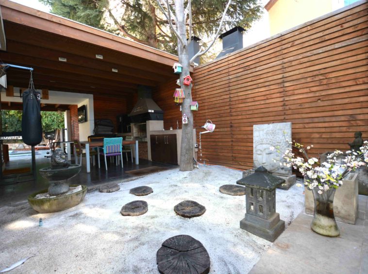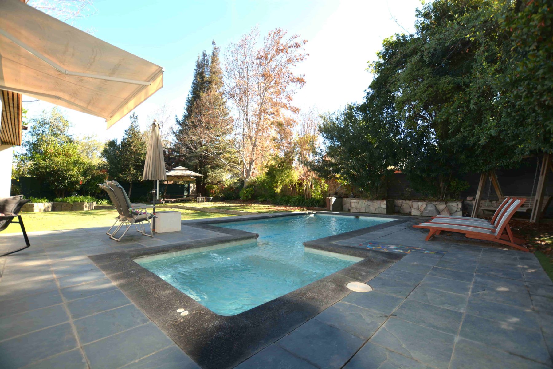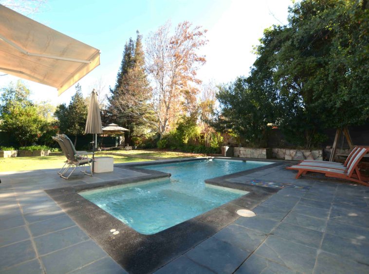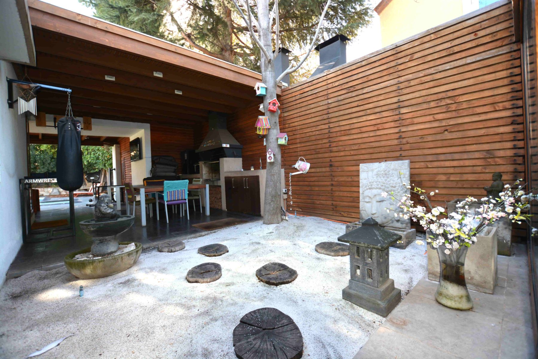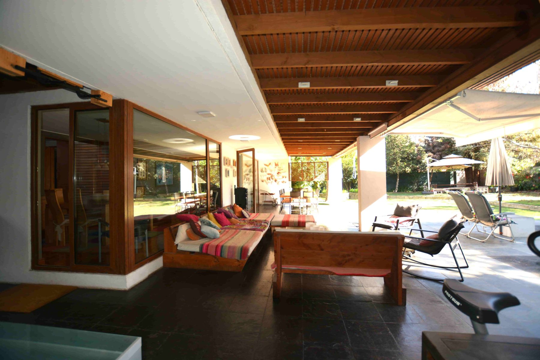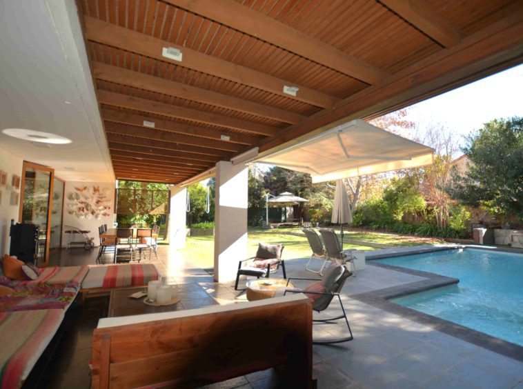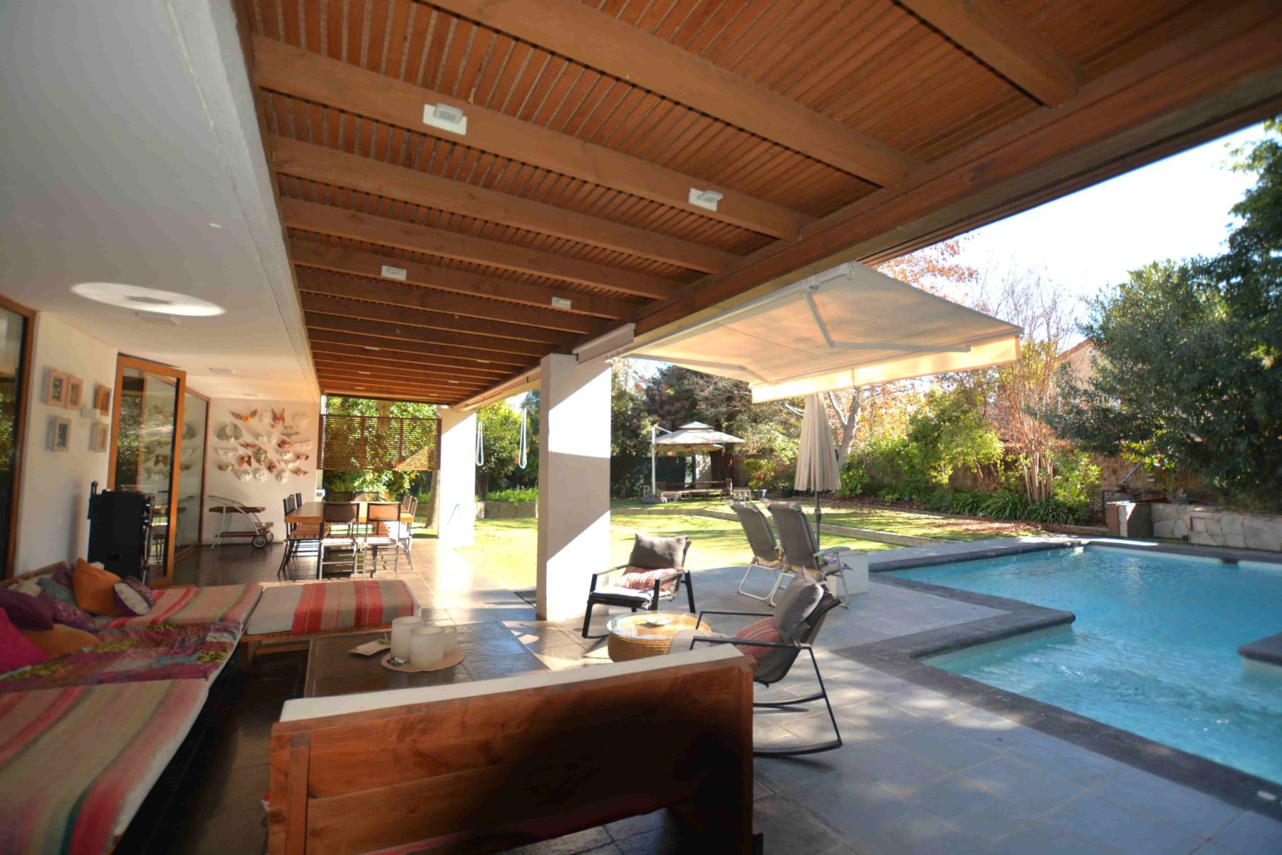 La piscina cuenta con espacio lateral para reposeras, rodeada de pasto sintético y grandes árboles y arbustos que entregan sombra y calidez al jardín. Un acogedor rincón de sombra con espacio para toldos, sofás y hamacas ofrece el lugar perfecto para el relajo al aire libre.